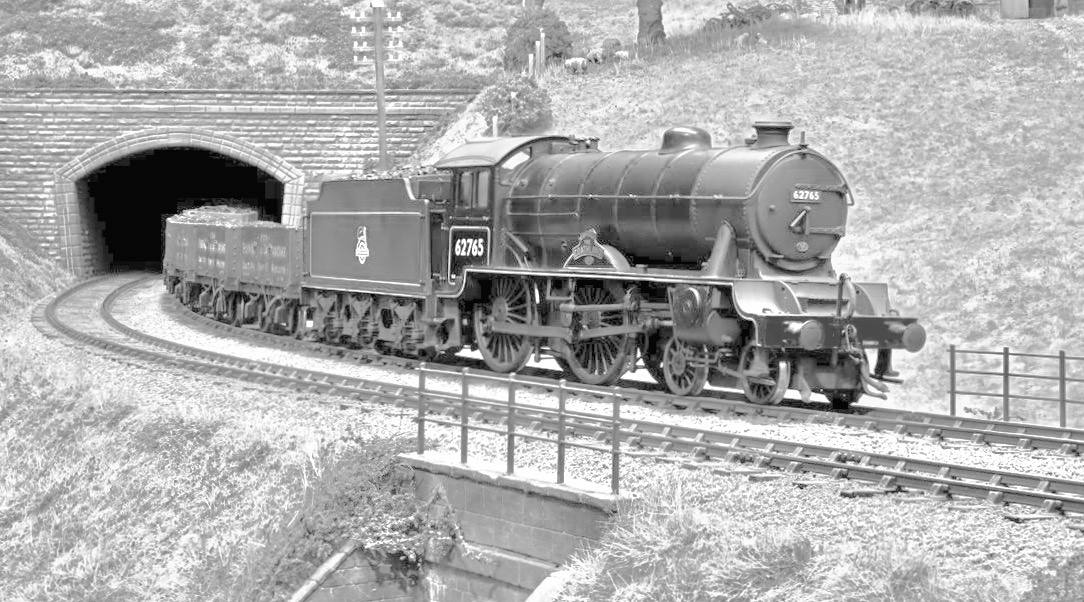 Gresley V2 No 60873 passing the end of the Hutton’s Ambo yard siding. Notice Neil’s ‘bare’ cutting side, with reduced scale ‘TT’ fencing with treeline beyond Giles Baxter.