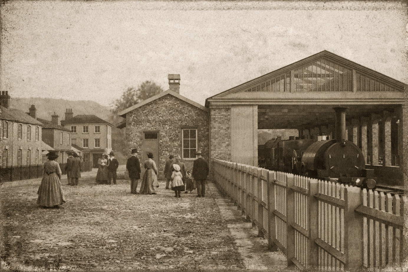 Daniel Gooch Broad gauge Corsair type locomotive of 1849, with wooden carriages at High Wycombe, with AI generated period figures, rendered in sepia tone , like a glass plate print. David Lane.