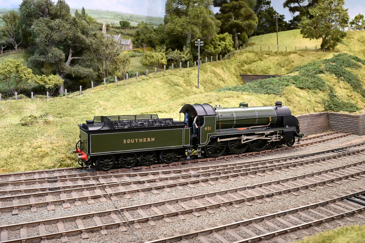 Designed by Richard Maunsell for the Southern Railway in 1930, the ‘V Class’, better known as the ‘Schools’ Class’ were essentially a modified ‘Lord Nelson’ locomotive. Maunsell used the round-topped firebox from the ‘King Arthur’ class, which had the useful side-effect of making them narrow enough for routes such as Tonbridge to Hastings with it’s restricted loading gauge. No 926 ‘Repton’ was completed at Eastleigh in May 1934 and spent most of it’s working life in the Bournemouth area. The superb model in it’s BR livery was brought along by the well known painting & lining expert Ian Rathbone.