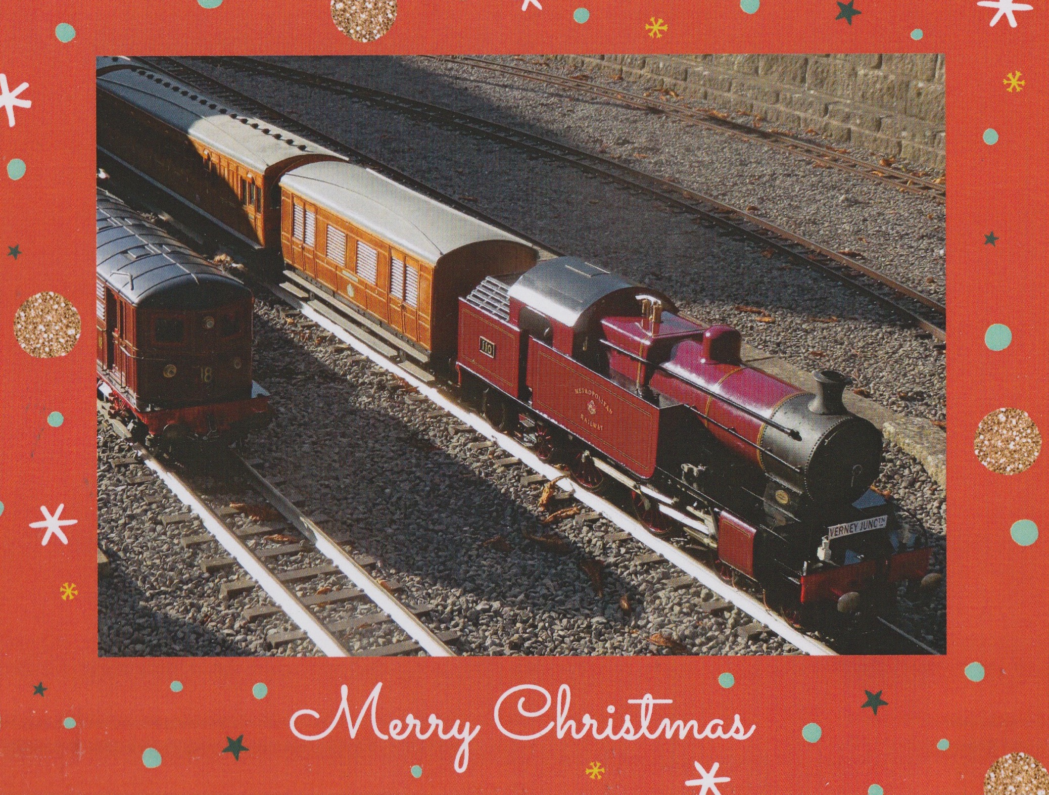 This was a Christmas card from my friend and colleague Dave Alexander, showing a view of his fabulous five inch gauge Metropolitan Railway ‘H Class’ locomotive, and scale teak bodied met vehicles.