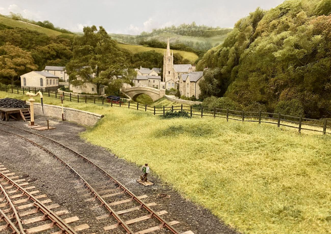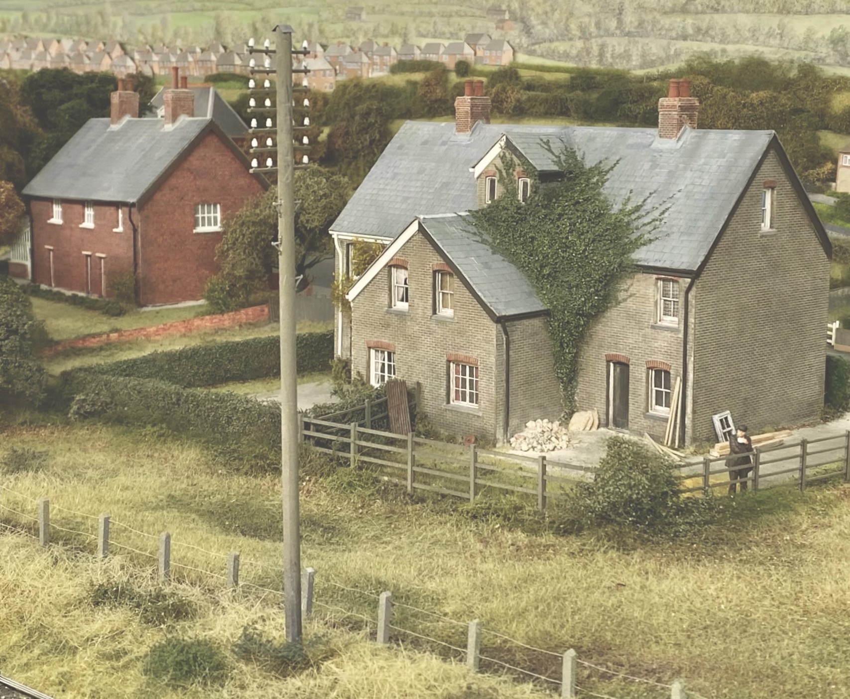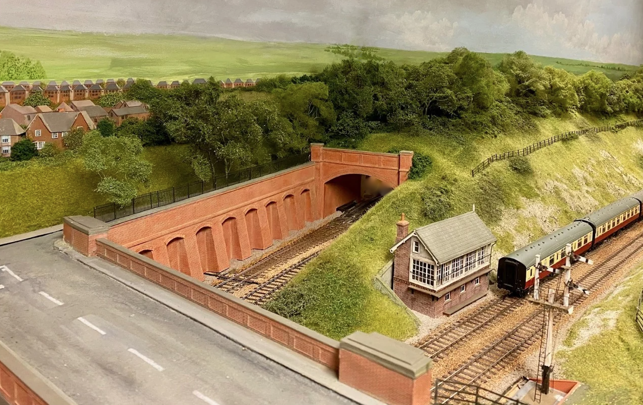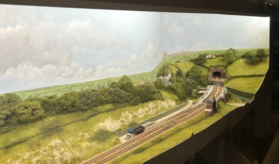 The structure effectively obscures any view into the fiddle yard on this end to end layout, so it’s a perfect example of a view blocking device that also incorporates local interest. The forced perspective backscene shows the cottages and red brick viaduct in middle distance.
