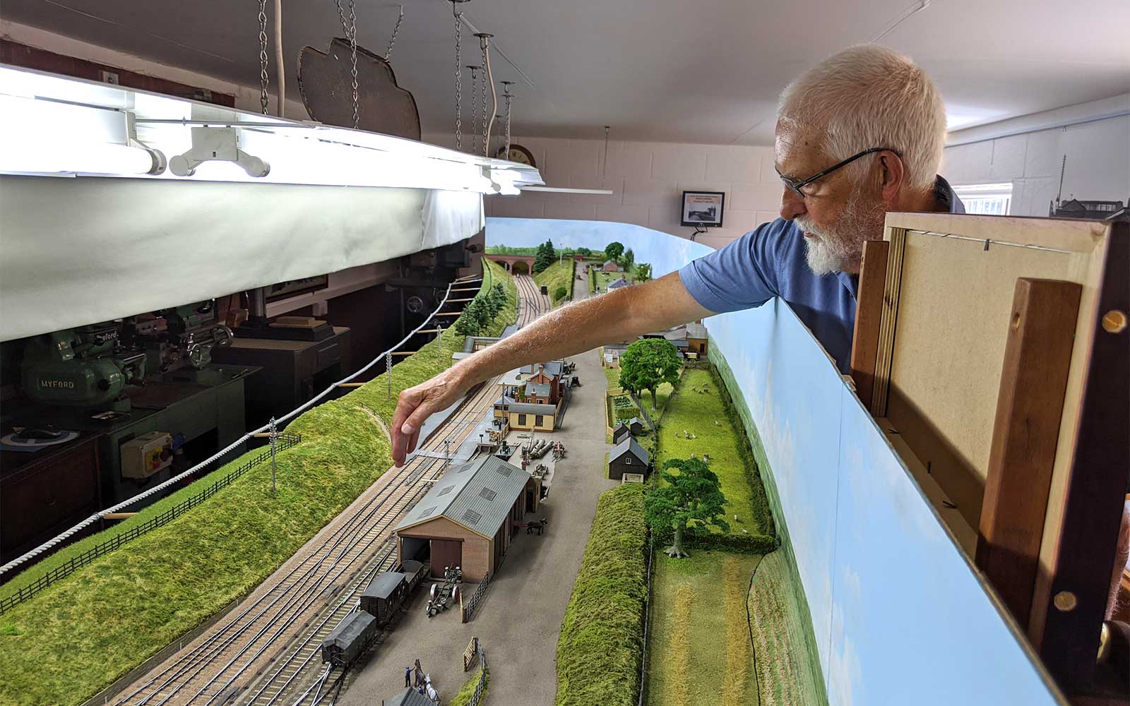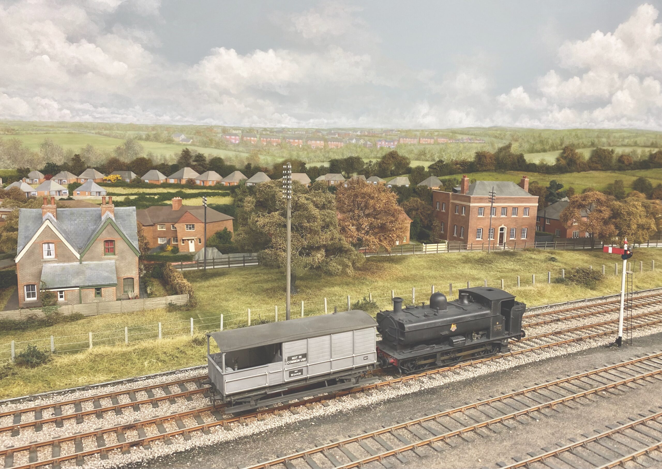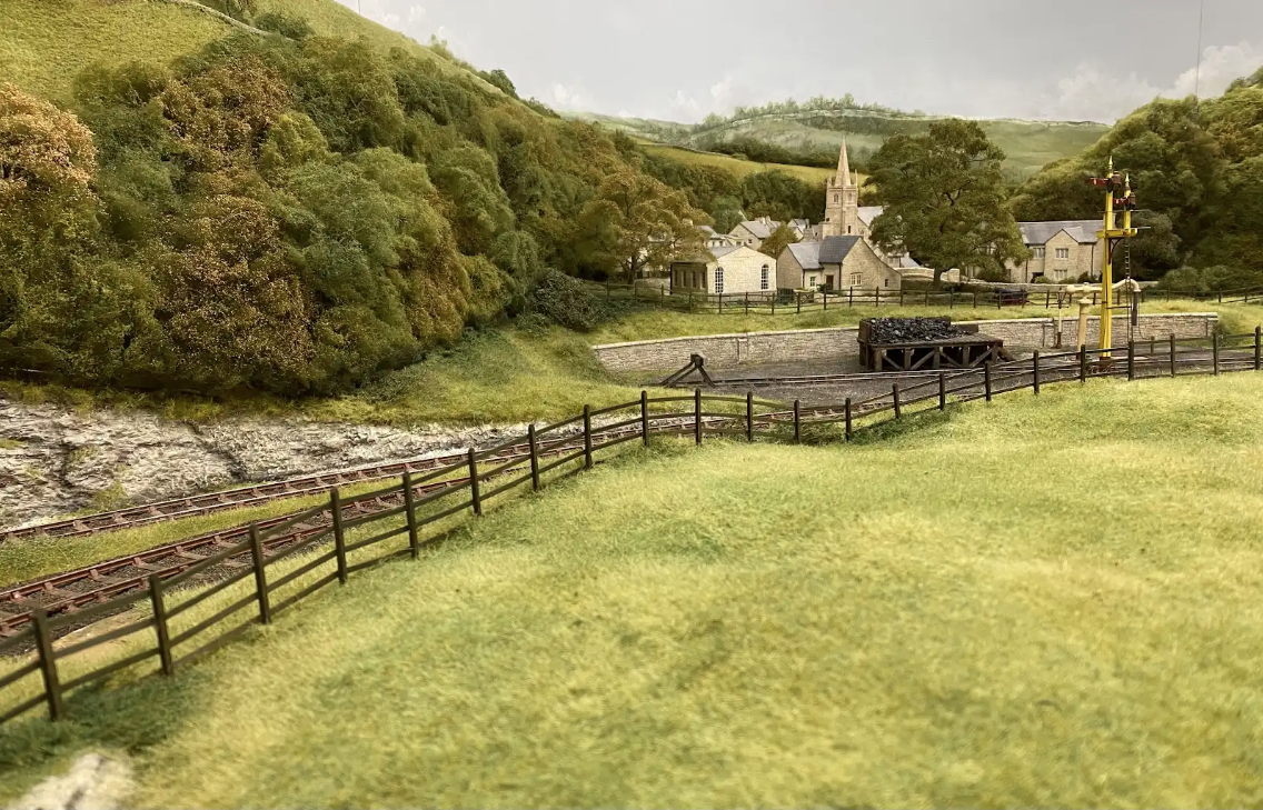 The structure effectively obscures any view into the fiddle yard on this end to end layout, so it’s a perfect example of a view blocking device that also incorporates local interest. The forced perspective backscene shows the cottages and red brick viaduct in middle distance.