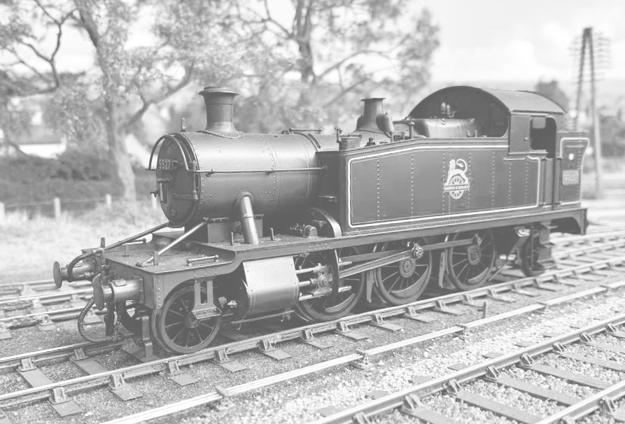 Small Prairie 2-6-2T No 5527 in one of the Marlow Donkey exchange sidings to the west of the station. This was from the GWR 4575 Class (often grouped under the 55xx series in BR era numbering style). It emerged new from Swindon Works in May 1928, developed from Churchward’s 4500 Class by Charles Collett, with larger side tanks featuring sloping tops for increased water capacity, making them suitable for branch line and mixed-traffic work. Modelled here in early British Railways Western Region lined black, the Prairie was photographed in service in various locations, such as at Barry shed in 1957. Nigel Smith.