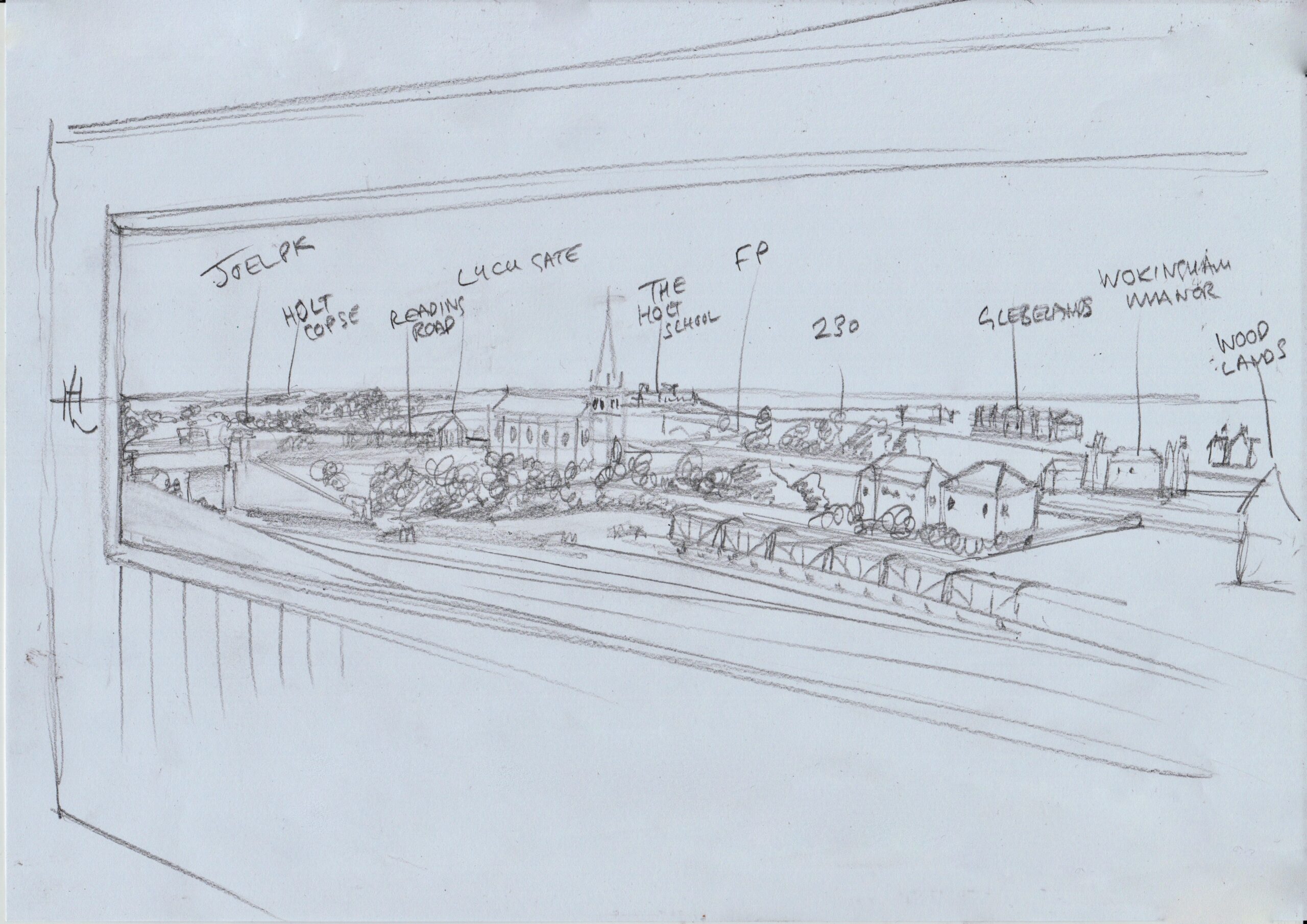 One of the Missenden models that’s going to need a backscene, so here’s a typical quickie sketch to roughly plot in the landmarks. this is Wokingham, looking NW.