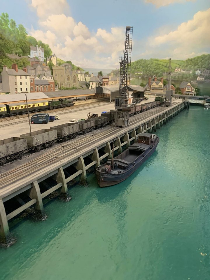 The Waterhead Creek section of Kingswear’s backscene is basically there now, only needing some continuation of cloud cover to the left and a few more small craft beached on the tidal mud, along with their mooring ropes. A handsome Great Western Railway train rumbling across the metal bridge on it’s way inland will eventually complete the picture.